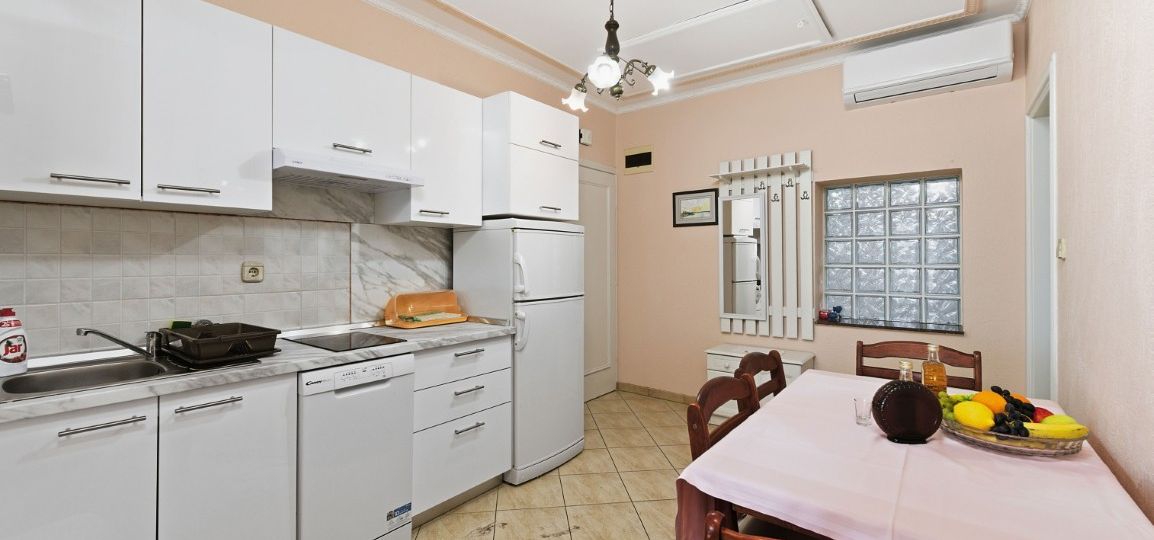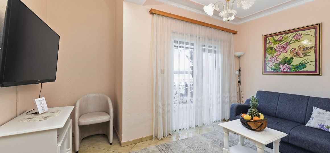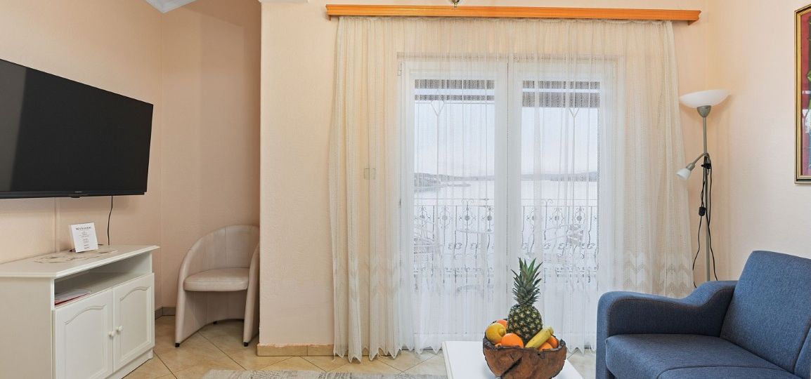 It consists of a living room with a TV, two bedrooms, a bathroom with a toilet. It is air-conditioned and has a terrace with a view of the beach and the sea.